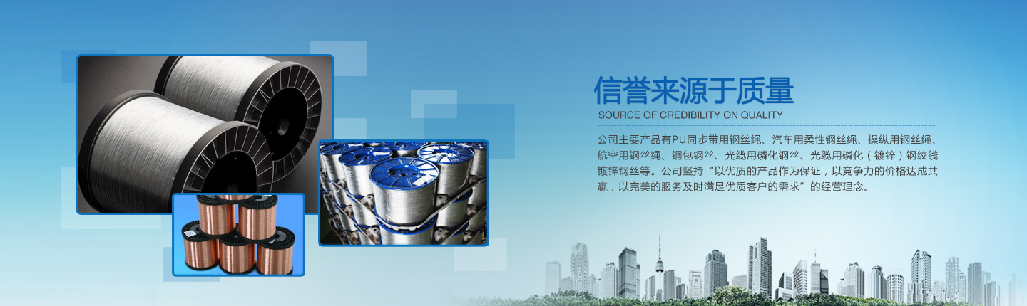 公司主要產(chǎn)品有PU同步帶用鋼絲繩、汽車(chē)用柔性鋼絲繩、操縱用鋼絲繩、航空用鋼絲繩、銅包鋼絲、光纜用磷化鋼絲、光纜用磷化(鍍鋅)鋼絞線(xiàn)、鍍鋅鋼絲等。經(jīng)過(guò)多年的研究、摸索、開(kāi)發(fā),公司已形成了完整的技術(shù)、工藝軟件,產(chǎn)品實(shí)物質(zhì)量均達(dá)到國(guó)際先進(jìn)水平。